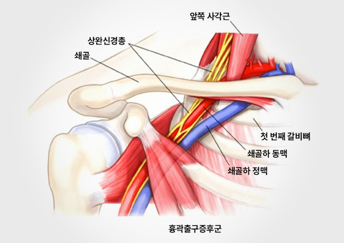 목에서 겨드랑이 사이의 터널과 같이 긴 공간을 일컫는 흉곽출구는 어깨 및 팔로 가는 가장 중요한 신경 다발과 혈관이 지나가는 통로입니다. 이 공간을 둘러싸고 있는 구조물들에 의해 신경다발과 혈관이 압박을 받아 발생하는 임상 증상을 흉곽출구증후군이라고 합니다. 목, 어깨 주변, 상지 등에 발생한 모호한 통증 또는 저림 증상 등으로 인해 주로 목디스크나 오십견, 어깨 회전근개질환 또는 주관증후군, 수근관 증후군 등으로 오인되는 경우가 많아 이에 대한 적극적인 치료에도 불구하고 증상의 호전이 일시적이거나 효과가 거의 없는 경우가 많습니다.